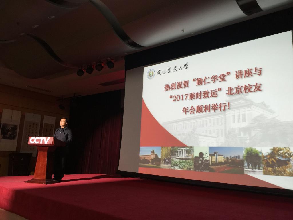 2017年12月23日,南京农业大学“勤仁学堂”首讲暨“2017 乘时致远”北京校友年会于中央电视台军事·农业频道(CCTV-7)中国农业电影电视中心多功能厅举行。南京农业大学副校长胡锋、校友总会副会长孙健、农学72级校友王红谊(北京校友会名誉会长、中国农业历史学会常务副理事长)、兽医专业80级校友薛廷伍(北京校友会名誉会长、中国牧工商(集团)总公司总经理)、畜牧学91级校友吴培均(北京校友会会长、北京科为博生物集团董事长)以及来自北京各界的校友共100多人参加了北京校友会“勤仁学堂”活动暨北京校友年会。